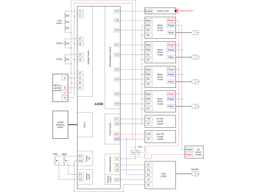 AXBB-E se jednoduše připojí k PC pomocí Ethernet kabelu (přímé připojení nebo přes router/switch). Napájení se připojí k napájecím svorkám (5V + 12-24V). Konfigurace se provádí v softwaru UCCNC (doporučeno), Mach3 nebo Mach4. Všechny parametry včetně frekvence kroků, pinů, vstupů a výstupů jsou plně konfigurovatelné podle vašich potřeb.