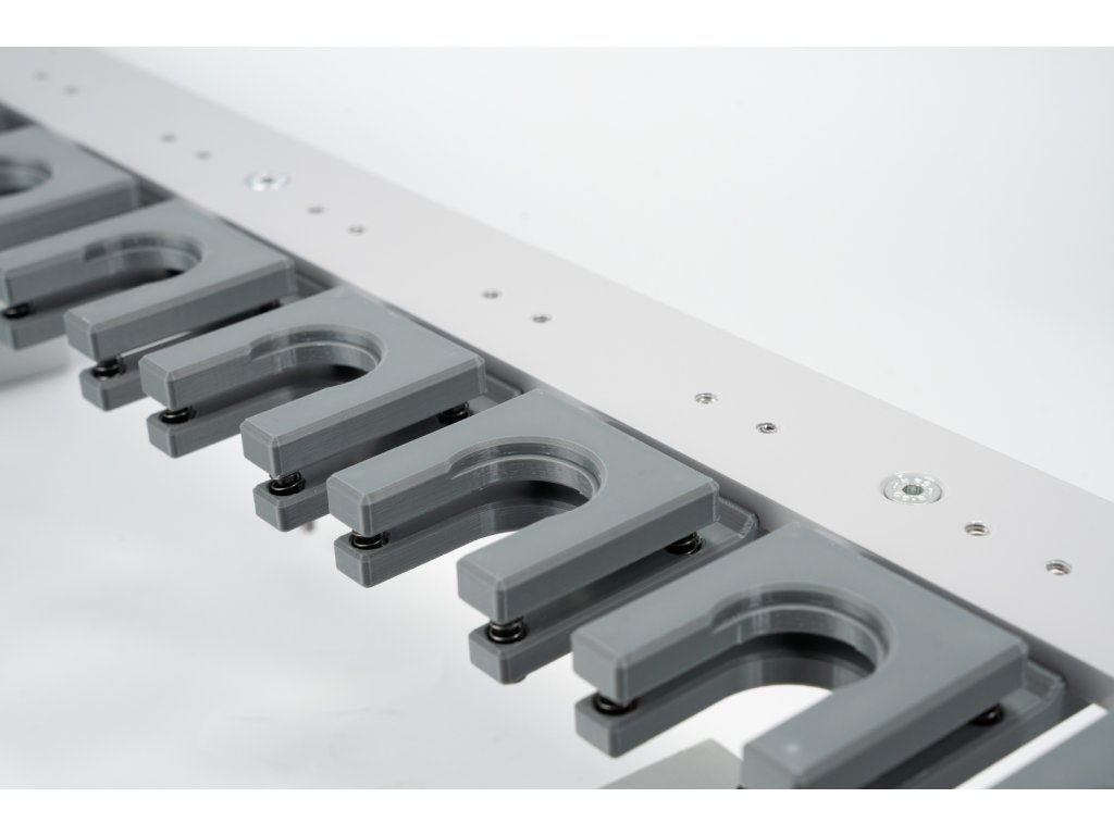 10 trámců, 12 spojovacích profilů a 6 integrovaných nohou stroje společně se dvěma masivními nosníky podél osy Y tvoří torzně odolný základ stroje a vytváří optimální podpěrnou plochu pro pracovní stůl stroje, který přispívá k dalšímu zesílení rámu.