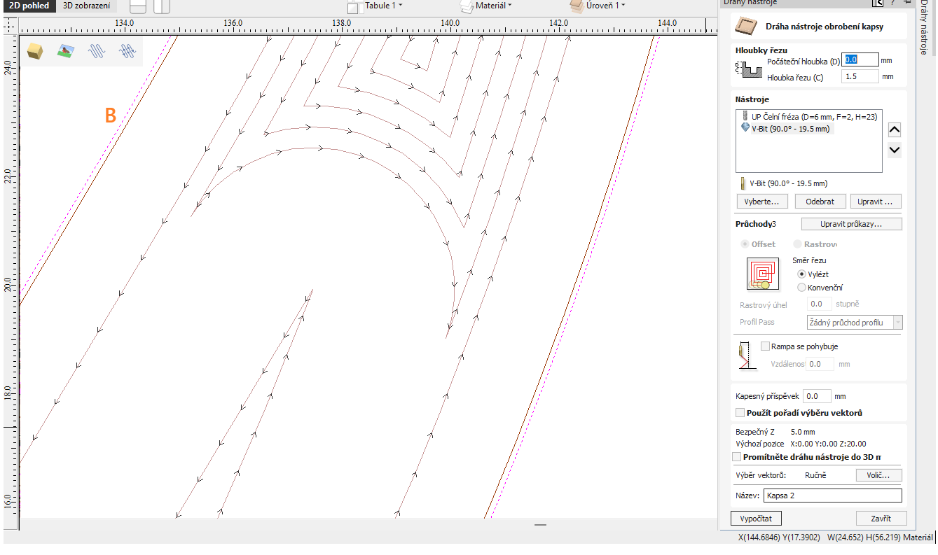 - Pak spusťte Druhý toolpath - Kapsa č. 1 (V-bit, originální vektor)