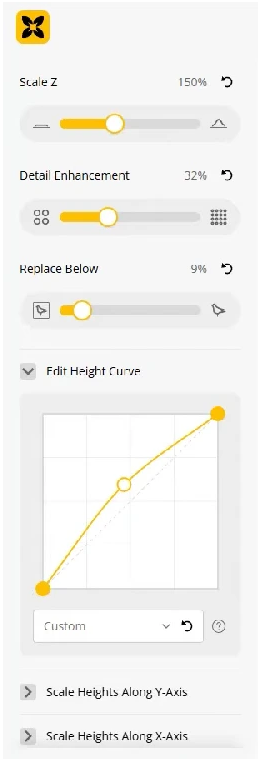 - Scale Heights along Y-Axis - Umožní deformovat průběh výškové křivky podél osy Y